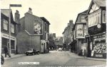 The garage on 'The Cross' with the two hand-operated pumps. It later became 'Shands' while the garage proprietor moved to his new site next to the 'Malt Shovel Inn.'